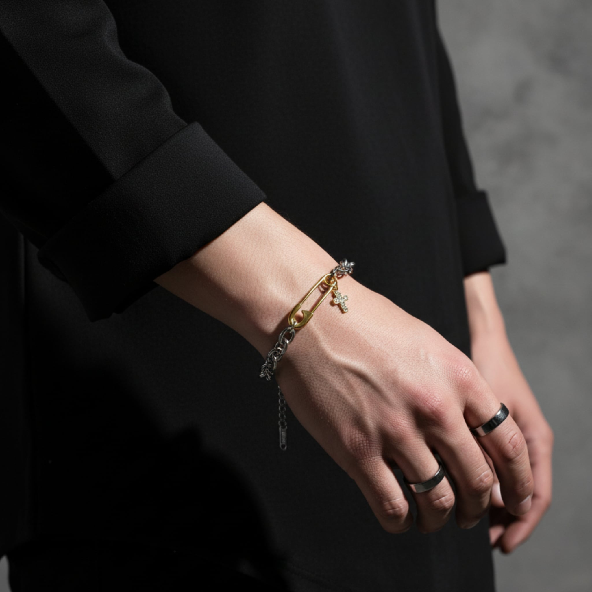 シルバーのチェーンに、ゴールドの安全ピンモチーフと煌めくクロスチャームを組み合わせ、洗練された遊び心を演出します。